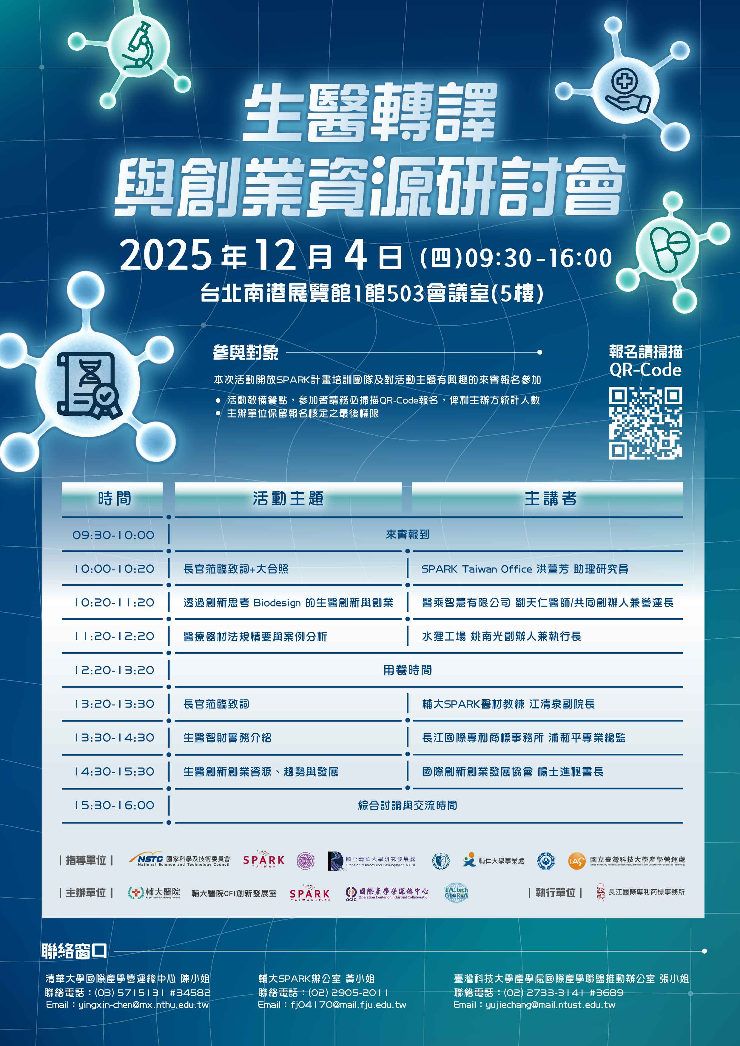 活動主旨:生醫轉譯與創業資源研討會 活動時間:2025年12月4日(四) 09:30-16:00 活動地點:台北南港展覽館1館5樓503會議室(5樓)